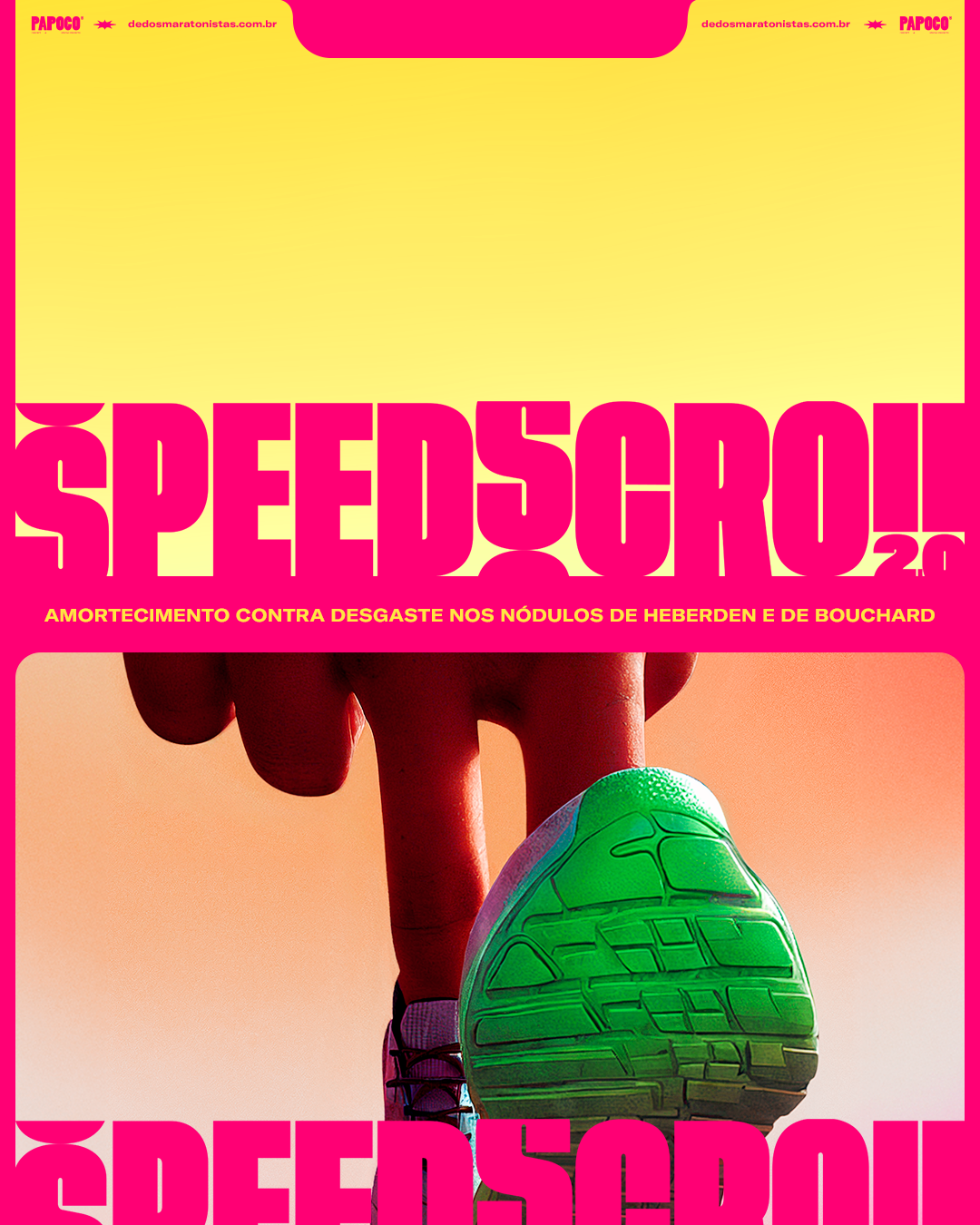 Your fingers run more than you do. On average, Brazilians walk 1.8 km a day, but scroll 2 km of screen with their fingertips. So we created SpeedScroll 2.0, the first 3D-printed running shoes for your fingertips. Light, ergonomic and built with a touch-friendly sole, they protect your “marathoner fingers” while you sprint through your feed.